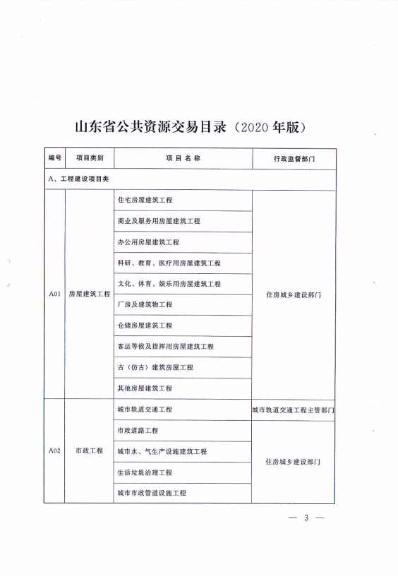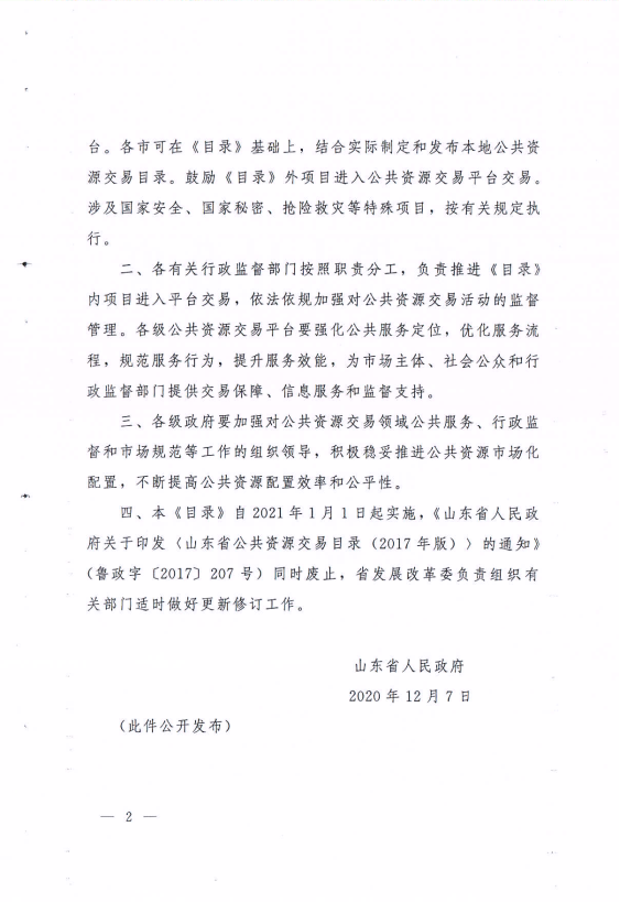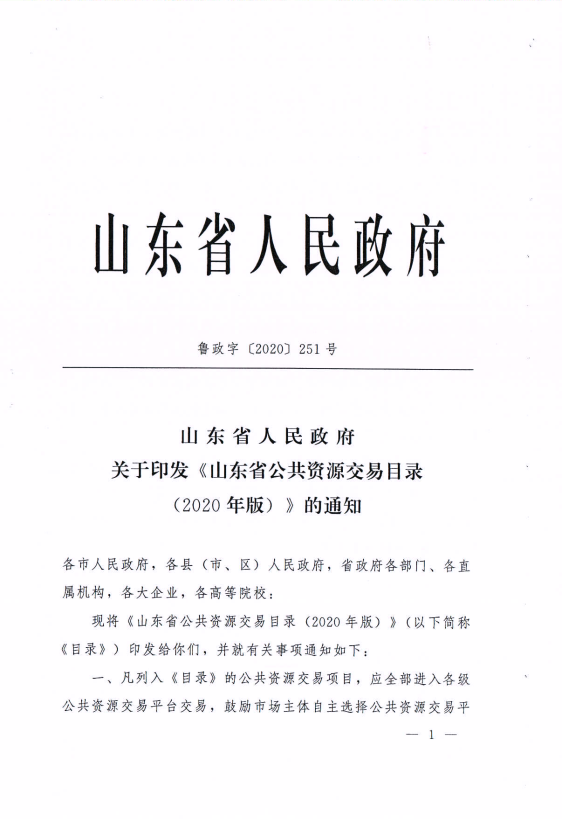 山东省人民政府关于印发《山东省公共资源交易目录(2020年版)》的通知